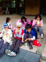 体験学習の後は、おやつタイムです。川場名物のアップルパイと牛乳です。