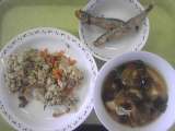 本日の給食です。 豚肉とごぼうのご飯 みそ汁 ししゃもの唐揚げ 牛乳