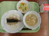 献立は「魚のかば焼き丼、キャベツの塩こんぶかけ、みそ汁、牛乳」です。 *食...