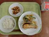 献立は「ミルクパン、魚のエスカベージュ、コーンポテト、ベーコンと白菜のスープ、牛...