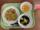 献立は「カレー焼きそば、わかめスープ、フルーツポンチ、牛乳」です。 *食材...