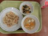 献立は「わかめごはん、五目うま煮、野菜のおかかかけ、ぶどうゼリー、牛乳」です。 ...