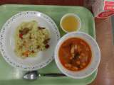 献立は「パエリア、ミネストローネ、みかんゼリー、牛乳」です。 *食材産地*...