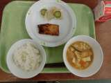 献立は「麦ごはん、いかのかりんとあげ、麻婆汁、大根ときゅうりのごま風味、牛乳」で...