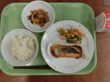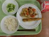 献立は「ごはん、魚のカレーあげ、筑前煮、野菜のひとしお、牛乳」です。 *食...