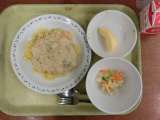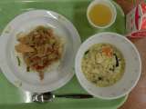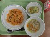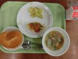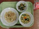 献立は「チキンライス、ポテトクリーム焼き、パスタ入りスープ、牛乳」です。 ...