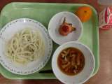 献立は「五目冷やしつけうどん、ポテトドッグ、冷凍みかん、牛乳」です。 *食...