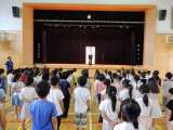 今朝は、5,6年生が体育館に集合し、他の学年は教室のオンラインで行いました。梅雨...