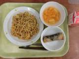献立は「カレー焼きそば、魚の包み揚げ、フルーツポンチ、牛乳」です。 *食材...