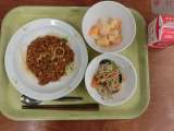 献立は「ジャージャー麺、塩ナムル、フルーツヨーグルト、牛乳」です。 *食材...