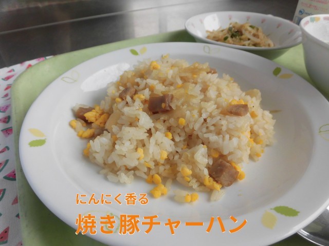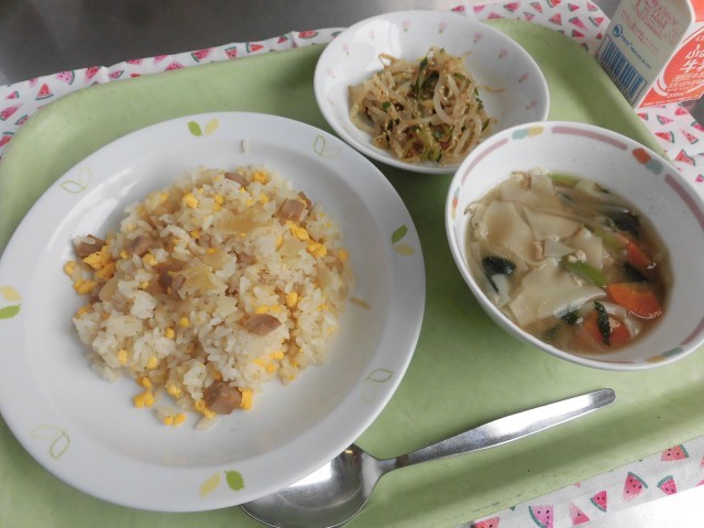 🐖献立🐖 焼き豚チャーハン・もやしときゅうりの中華サラダ・ワンタンスープ・牛乳