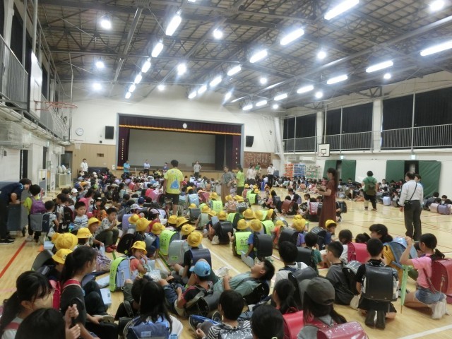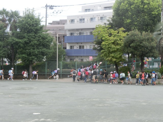 7月の避難訓練は、集団下校です。もし近隣に不審者等が現れたらどう対応するか、というテーマに、安全に下校するために訓練は行われています。警察から連絡があった時などは、実際にこういった対応を迫られることはあります。児童の安全意識を高め、迅速に行動できるように、訓練は行われています。