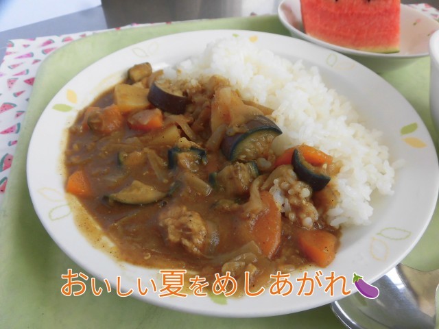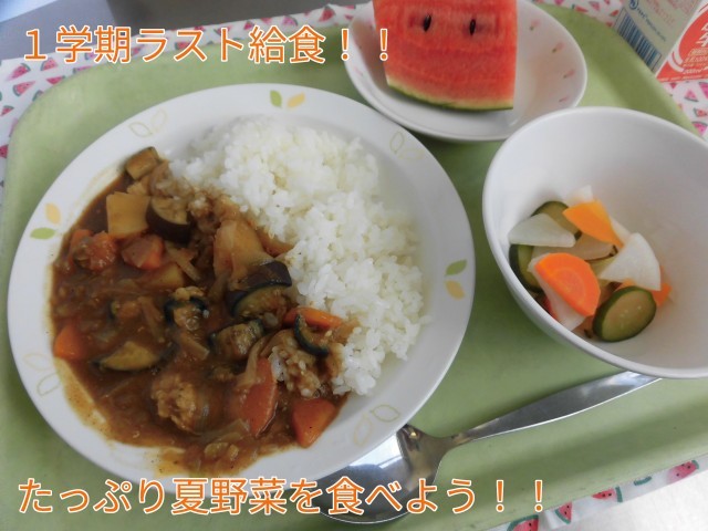 🌻献立🌻 夏野菜カレーライス・ピクルス・くだもの(小玉すいか)・牛乳