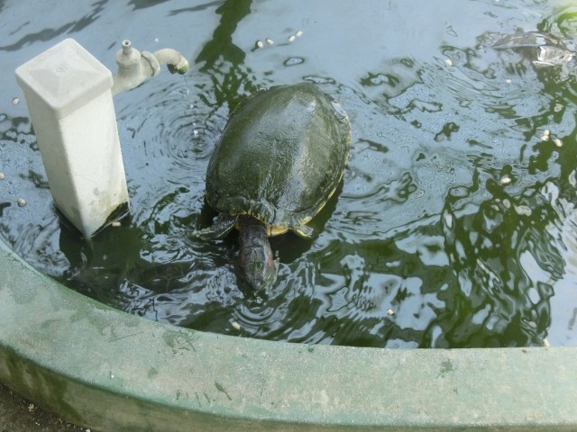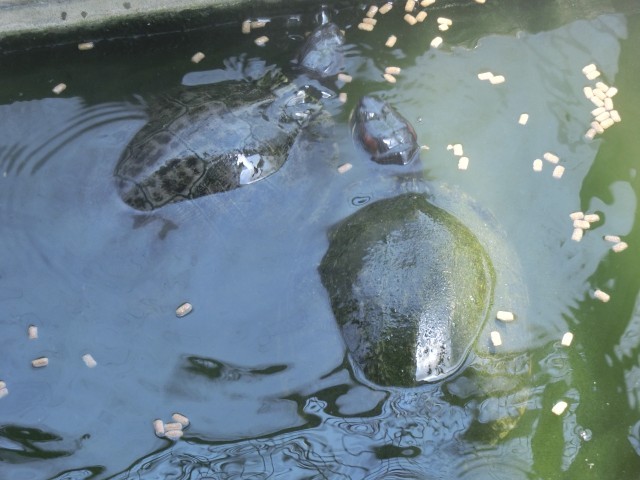 本校のカメ池には、アカミミガメ3匹(♀)、クサガメ2匹(♂1 ♀1)の計5匹が暮らしています。夏は大量の餌を食べます。人によくなれており、池に餌をあげに行くと、我先にと近寄ってきて餌を求めてきます。今日もたくさん餌を食べ、寒い冬に備えて体力をつけています。