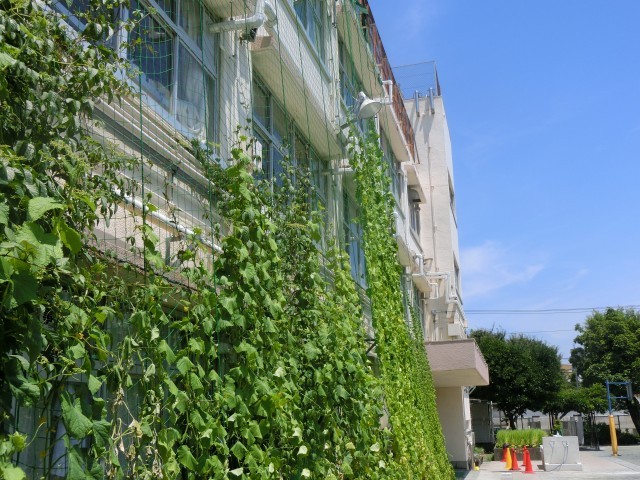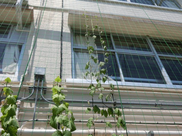 プランターに植えた緑のカーテンは、ついに3階に達しました。これからヘチマが大きくなり、朝顔の弦もどこまで伸びるんだろう・・というぐらいになっています。8月を過ぎたころには一体どうなっているのか、楽しみです。