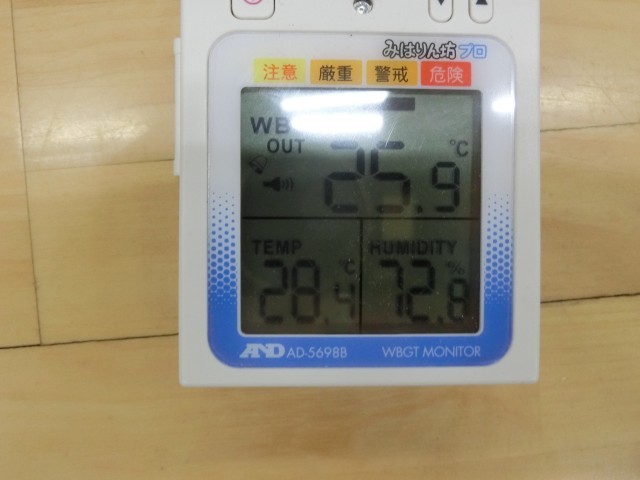 本日は朝から晴れ。冷房は一切つけずに、体育館を閉めた状態で15:00に体育館の中心に温度計を置いて記録したところ、なんと室温が25.9度・・ちょっと信じられないですが、これで夏の体育館が涼しく利用できることは間違いないです。