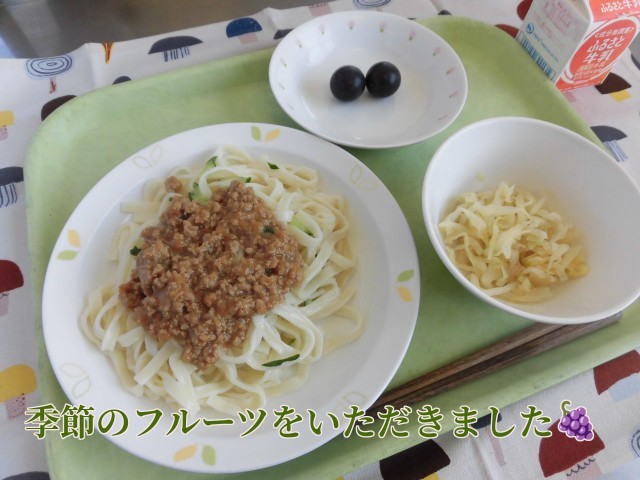 🌰献立🌰じゃじゃ麺・ピリ辛キャベツ・くだもの(ぶどう)・牛乳