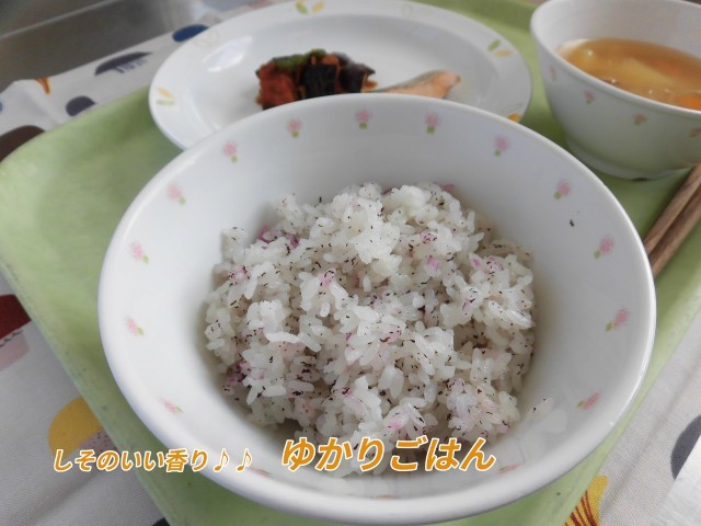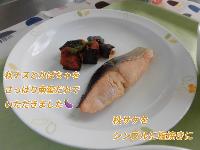 🌰献立🌰 ゆかりごはん・さけの塩焼き・なすとかぼちゃの南蛮づけ・みそけんちん・牛乳