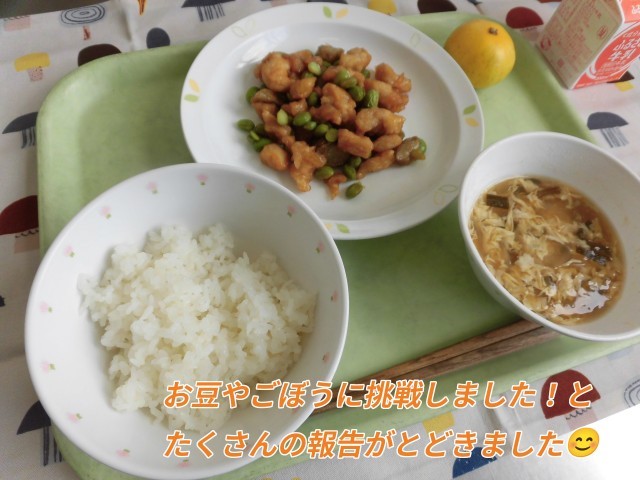 🌰献立🌰 ごはん・チキンチキンごぼう・にらたま汁・くだもの(みかん)・牛乳