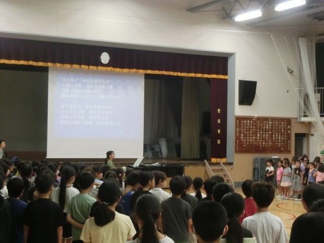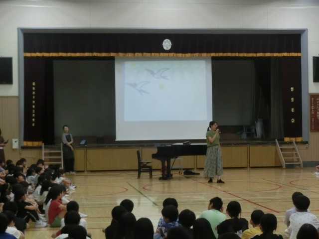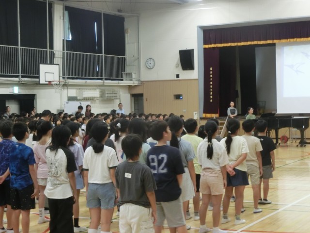 今日の音楽朝会では、YOASOBIさんの「ツバメ」を歌いました。校歌で声慣らしをした後歌いましたが、とても高いキーなので、発声に苦労していたようでした。体育館から帰る時も口ずさみながら戻ってきていた子どもたちもいました。