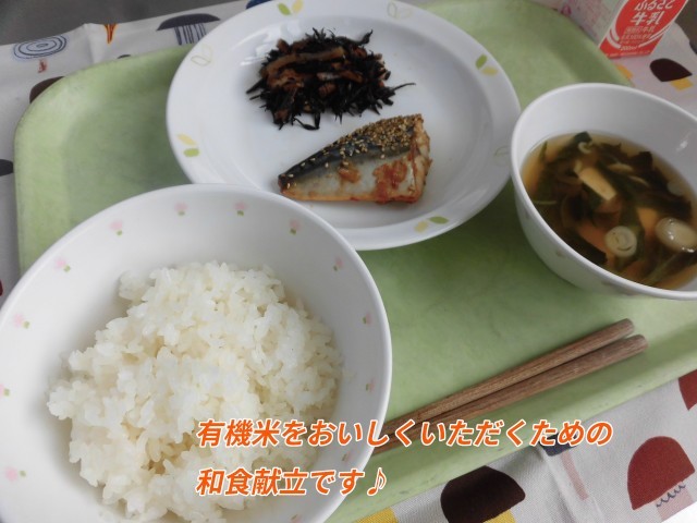 🌰献立🌰 ごはん・さばの一味焼き・ひじきの煮つけ・こまつなと豆腐のみそ汁・牛乳