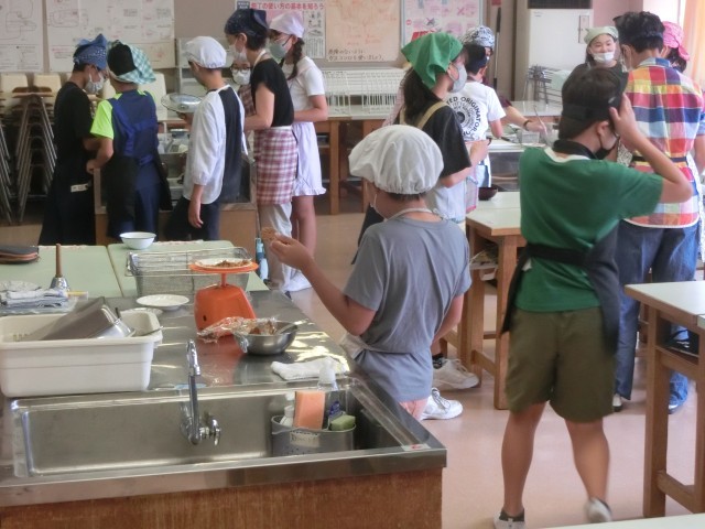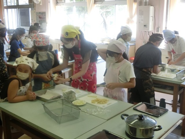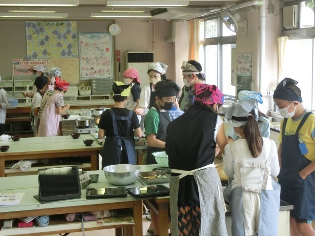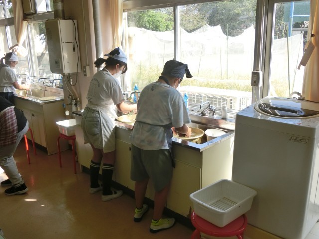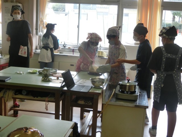 今日は調理実習で、ご飯を炊いて味噌汁と作りました。味噌汁は煮干しからだしをとり、揚げやネギ、大根なども自分たちで切って、保護者の方々のご協力をいただきながら自分たちの力で作り上げることができました。お手伝いをいただきました保護者の皆様、どうもありがとうございました。
