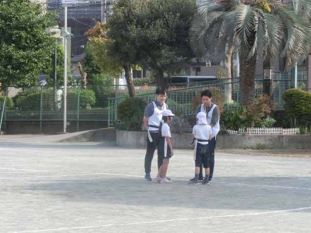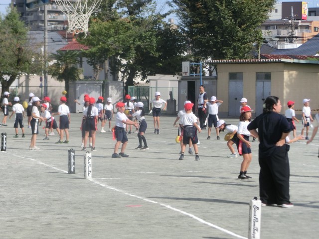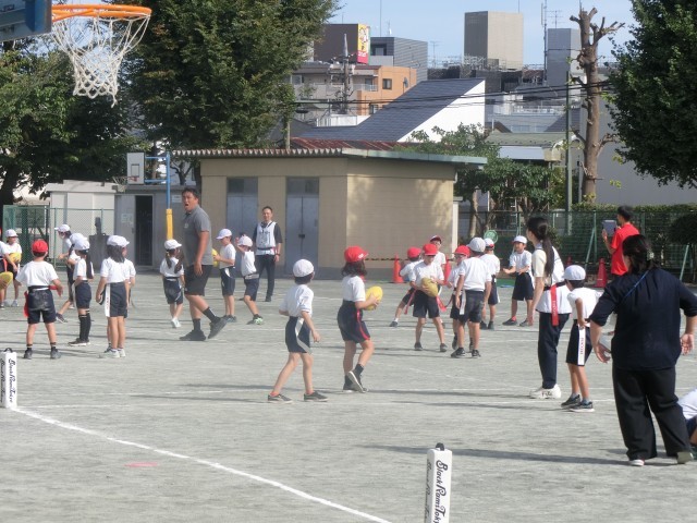 本校では、毎年3年生を対象にリコーブラックラムズの方々に来ていただき、タグラグビーの授業をしていただいています。今日の5時間目に校庭で行いました。たくさんのコーチに見守られながら、ボールの扱い方を学びました。