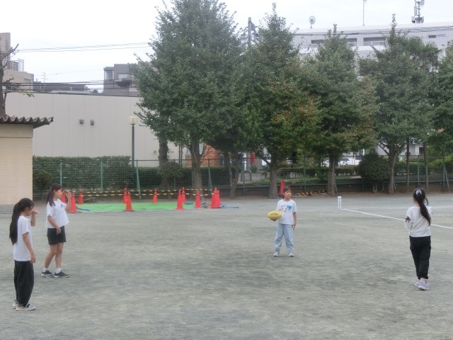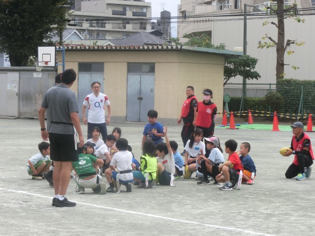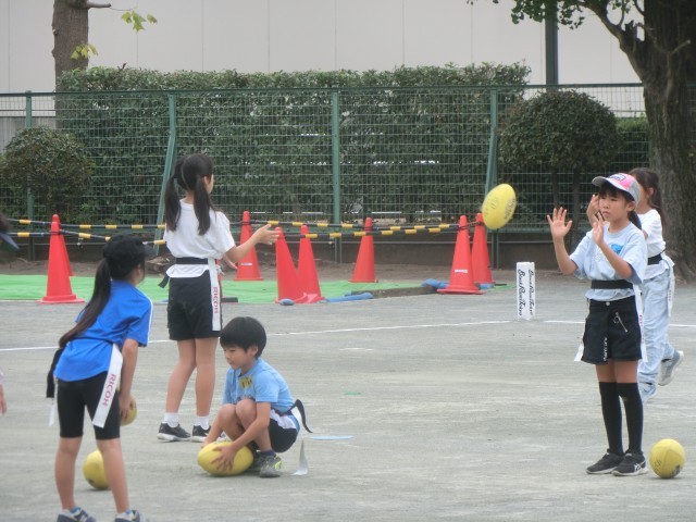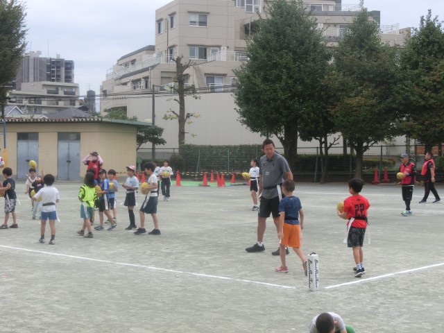 本日は、毎年東玉川町会さんが主催されているリコーブラックラムズによるタグラグビー講習会が行われました。一昨日も学校に来られているブラックラムズの皆さんが、きめ細かく指導してくださっています。