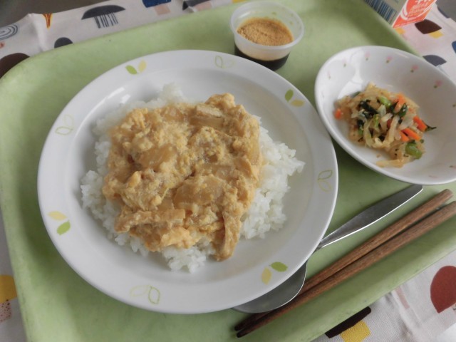 🍠献立🍠 衣笠丼・しらすと大根のさっぱりあえ・黒糖寒天・牛乳