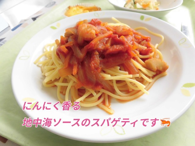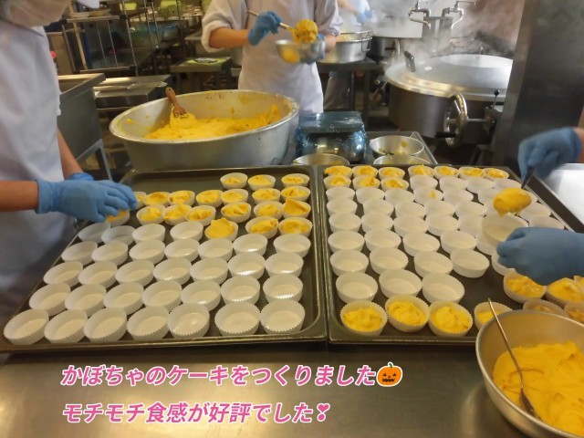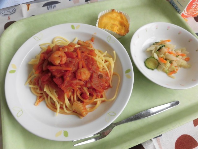 🎃献立🎃 スパゲティ地中海ソース・ツナレモンサラダ・米粉のかぼちゃケーキ・牛乳