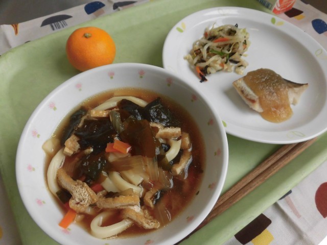 🍁献立🍁 きつねわかめうどん・たらのみぞれあんかけ・やさいの海苔あえ・くだもの(みかん)・牛乳