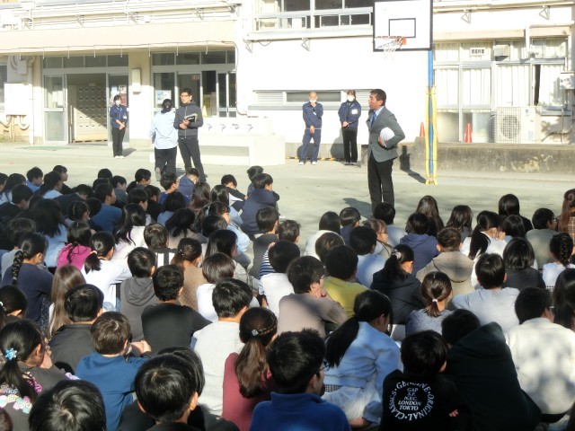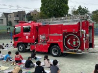 そして、今日の避難訓練の様子です。全校朝会後、近隣に火災が発生した場合という想定で避難を行いました。2次避難場所として、奥沢小学校や石川台中学校に避難することもあり、風の向きや建物への燃え移り方によって場所は変わるということなどを学習しました。