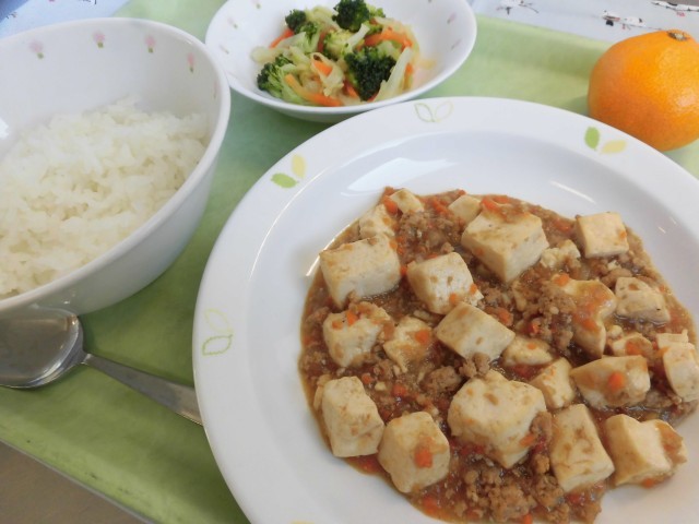 ⛄献立⛄ ごはん・麻婆豆腐・ブロッコリーの中華あえ・くだもの(みかん)・牛乳