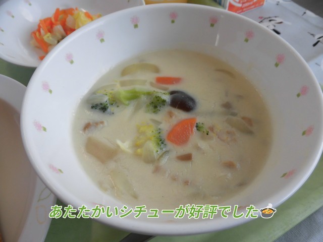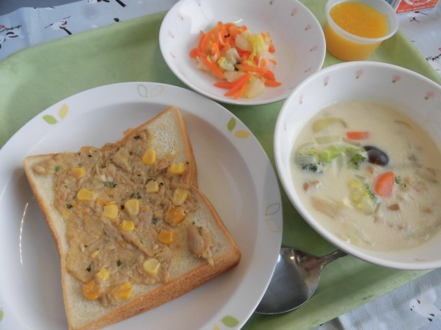 ⛄献立⛄ ツナコーントースト・冬野菜のクリームシチュー・白菜のサラダ・つぶつぶみかんゼリー・牛乳