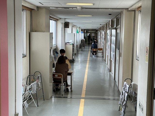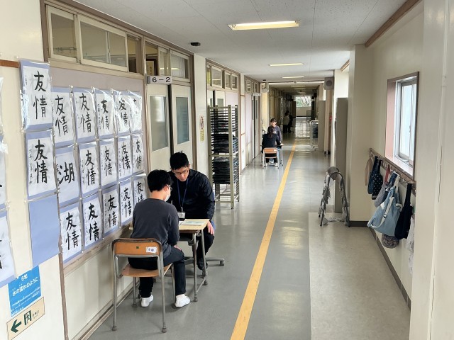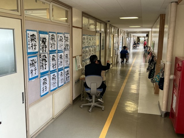通知表を渡しています。渡し方は担任の先生によって様々ですが、一人一人に対して丁寧に渡している姿が見られます。