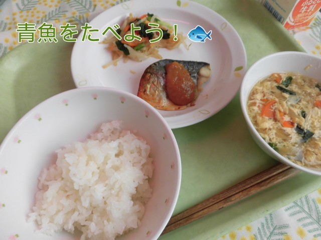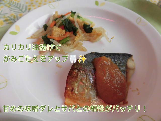 🌷献立🌷 ごはん・さばのみそだれかけ・カリカリ油揚げと野菜の和え物・かきまた汁・牛乳
