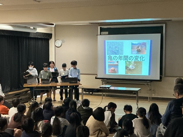 今日は、洗足池を1年間観察したまとめの発表会を行いました。城南学習支援グループの方々の指導のもと、それぞれがテーマをもち、季節の移り変わりで様子が違うことを学びました。