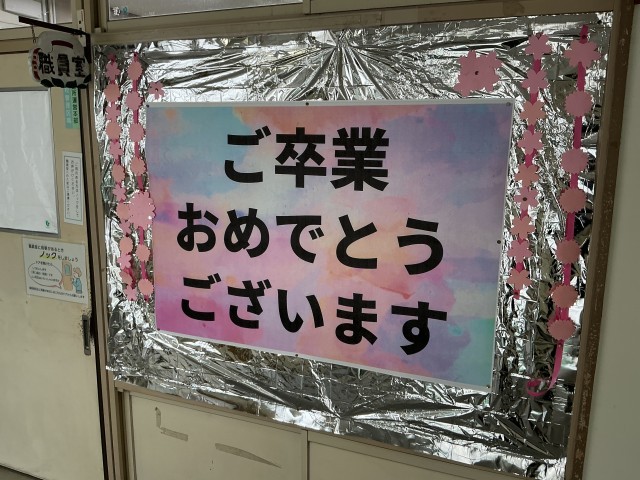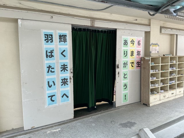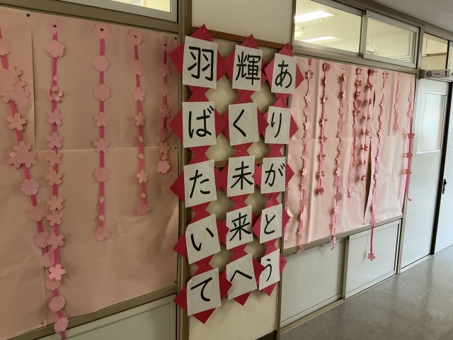 6年生の教室や体育館などに掲示が飾られました。あとわずかで卒業です。毎年のことなですが、喜ばしいことでもあり、寂しい気持ちにもなりますね。
