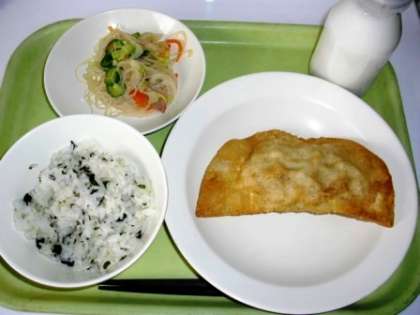 28日(水)の主菜は、本校の人気メニューの一つ「ジャンボぎょうざ」でした。