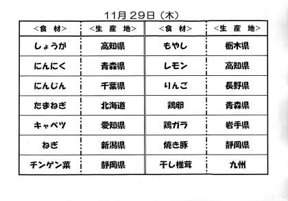 11月28日(水)の給食と29日(木)給食食材の産地について