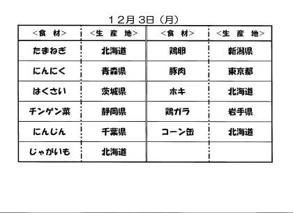 11月30日(金)の給食と12月3日(月)給食食材の産地について