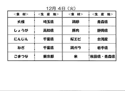 12月3日(月)の給食と4日(火)給食食材の産地について