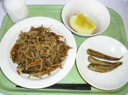 5日(水)は、子どもたちに人気のソース焼きそば、石川県の能登半島付近でとれたニギスをカレー風味の唐揚げにしたもの、りんご、牛乳という献立でした。焼きそばは作りすぎてしまったかなと思うぐらいの量でしたが、よく食べてくれて残りは少なかったです。また、ニギスはくせがなく、丸ごと食べやすい小魚なので、低学年もよく食べていました。