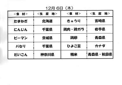 12月5日(水)の給食と6日(木)給食食材の産地について
