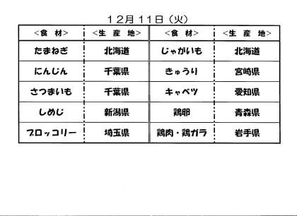 12月10日(月)の給食と11日(火)給食食材の産地について