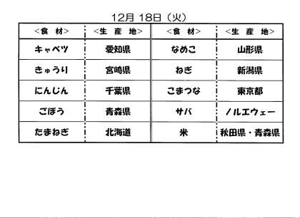12月17日(月)の給食と18日(火)給食食材の産地について