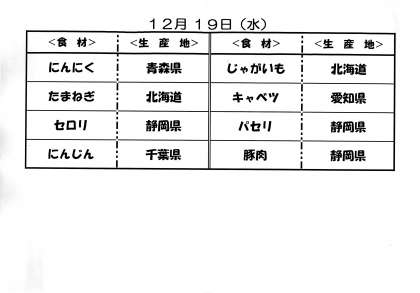 12月18日(火)の給食と19日(水)給食食材の産地について