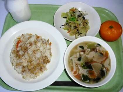20日(木)は、小さく切った油揚げと鶏肉が入った「こぎつねごはん」、具がたっぷりでとろみのついた「あんかけ汁」、お酢を少しきかせてさっぱりとした味の「野菜の海苔あえ」、「みかん」、「牛乳」というメニューでした。どれも残りは少なく、よく食べていました。