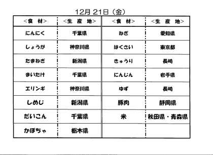 12月20日(木)の給食と21日(金)給食食材の産地について