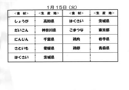 1月11日(金)の給食と15日(火)給食食材の産地について